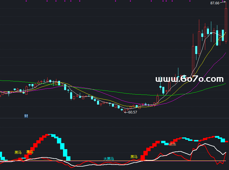 黑马线用55日周期扫描超跌股,当它突然拐头(A21<-10)配合5日均线上翘,底部图标亮起💡。而趋势线突破0轴时蹦出的「大黑马」提示,本质是21日价格强度与60日压制的共振结果,老股民都懂这种"弹簧压到底"的爆发力。