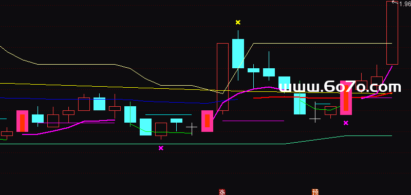 看多:IF(A1X>=0 AND BARSLAST(CROSS(A1X,0))>0,REF((C+O)/2,BARSLAST(CROSS(A1X,0))),DRAWNULL),COLORMAGENTA{,LINETHICK2};