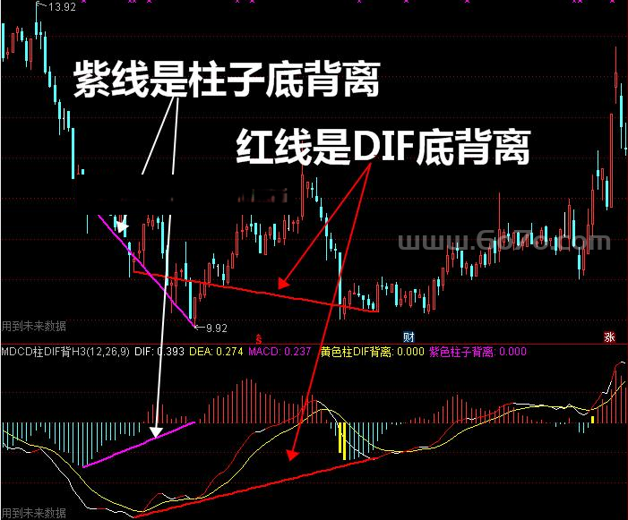 通常情况下MACD柱子出现背离现象要比DEA早,随后才会出现DEA的见底反弹。所以说MACD柱子的底背离更灵敏 🎯 底背离形态常常配合的是成交量的萎缩。如果随后出现成交量放大,股价上涨,那么此时的看涨信号更强烈。