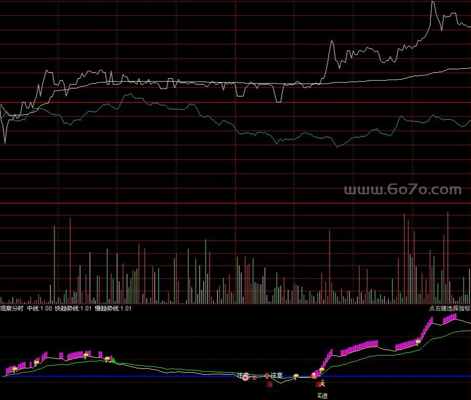 指标通过构建一个相对强度体系,寻找股价由弱转强(上穿中线)、并得到趋势确认(快穿慢且均在线上)的关键节点