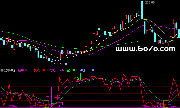 第二,结合"牛股"信号做共振 🟣🟡 源码里有个牛股信号(那个紫色的柱子),它是专门捕捉慢线上穿空线且数值极低的瞬间 ⚡ 当红色的吸筹柱还在持续,突然跳出了紫色的"牛股"信号,同时出现了黄色的买点图标(即选股点),这时候的成功率是最高的 🎯 这相当于主力吸筹完毕,准备点火启动,是你上车的最佳时机 🚗💨