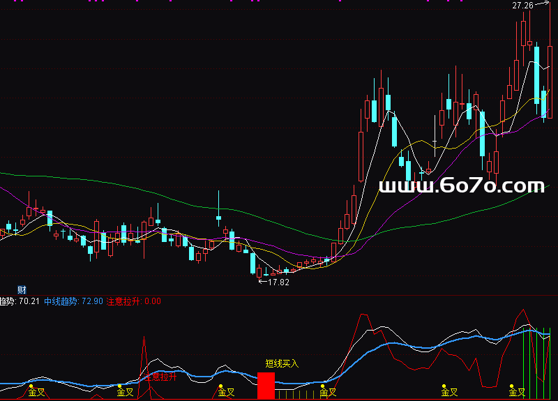 注意拉升:IF(CROSS(股海,90) AND (DD<40),70,0),COLORRED;