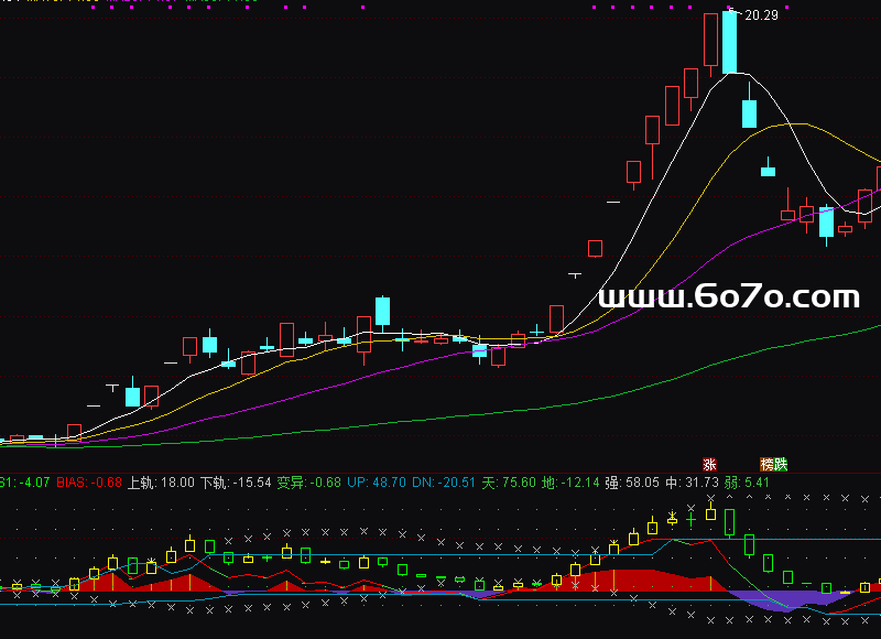 上轨:MA(BIAS1,20)+1.618*STD(BIAS2,20),COLORLIGRAY,CROSSDOT;