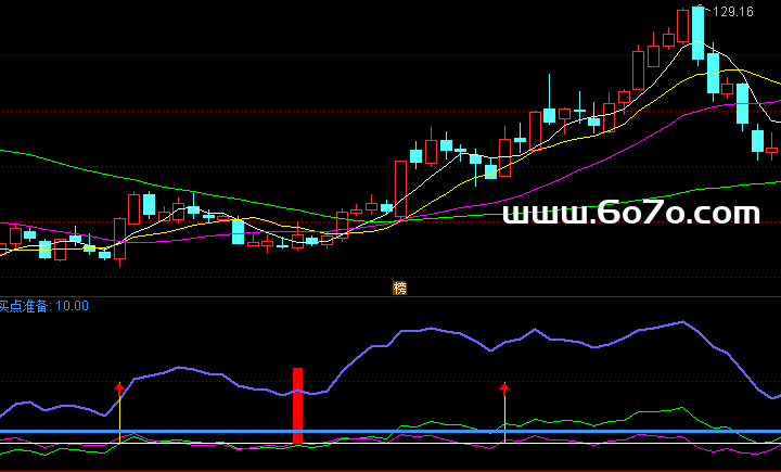 关键动作:当这根粉色趋势线从低位(≤10)上穿10值,相当于汽车仪表盘亮起"发动机启动"指示灯!说明下跌动能衰竭,趋势可能反转。(源码中对应STICKLINE(CROSS(趋势线,10)…的白色柱状信号)