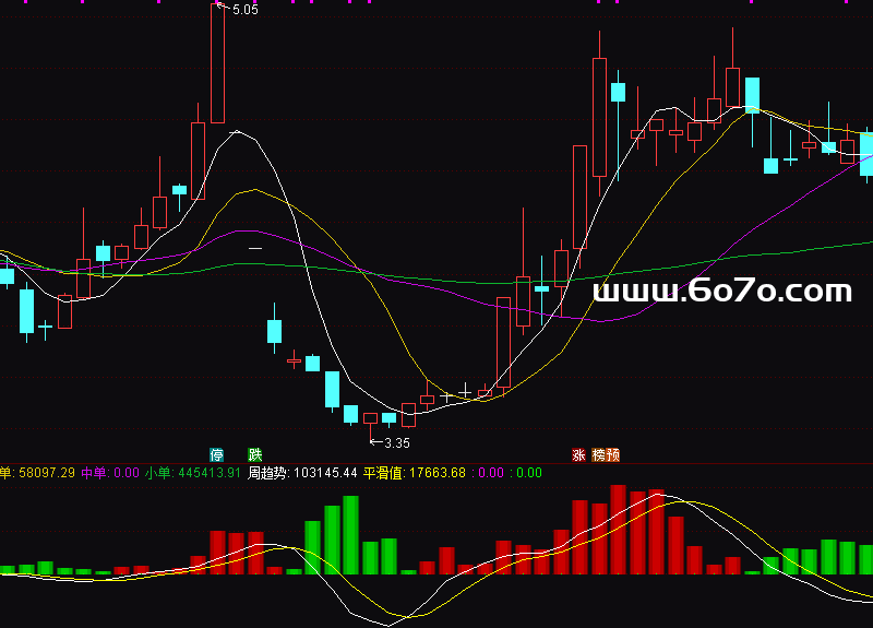 平滑值:EMA((5*M+4*REF(M,1)+3*REF(M,2)+2*REF(M,3)+REF(M,4))/15,1),COLOR00FFFF;