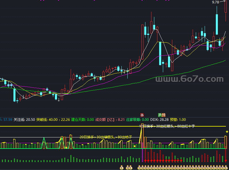 DRAWTEXT(CURRBARSCOUNT=30,突破线,'10日换手>30出红箭头,>80出红十字');DRAWTEXT(CURRBARSCOUNT=50,关注线,'20日换手>30出绿箭头,>80出桔子'),COLOR00FFFF;