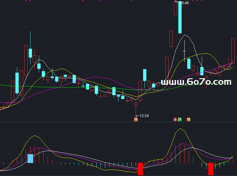 接着,指标通过复杂的平滑计算(EMA),生成了那根彩色的"指标"柱线(COLORSTICK)和K、D、J线。