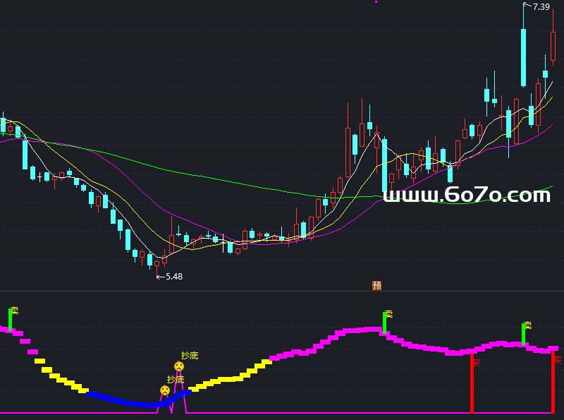 它通过近19天的最高价和最低价划定价格波动区间,再用5日和3日EMA均线做双重过滤。说白了就是给股价装了个"弹簧"——当股价跌到区间下沿时弹簧压缩蓄力(出现抄底信号),涨到上沿时弹簧回弹(触发卖出信号)。这个设计巧妙之处在于,既避免了短期波动干扰,又能及时捕捉趋势反转。