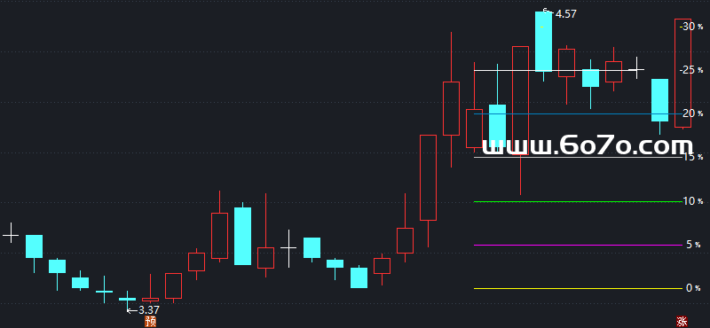 第三步:在路上提前插好"里程碑"。 光是知道总涨幅还不够,路上有哪些关键点位?指标直接在K线图上,以那个基准价为起点,向上画出了一系列"刻度线":涨5%、涨10%、涨15%……一直到涨35%。每一档都有一条水平线和清晰的百分比标注。