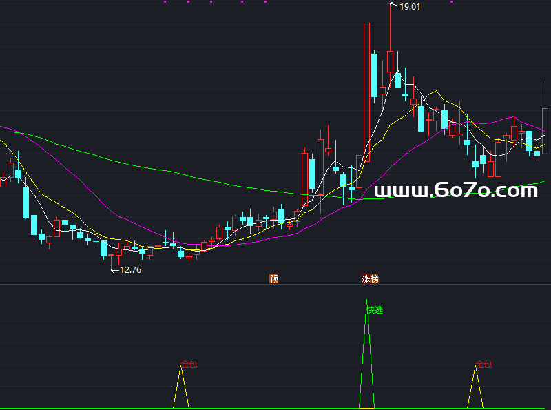 金包: IF(TROUGHBARS(3,15,1)=0 AND HIGH>LOW+0.01,20,0),COLORYELLOW ,LINETHICK1 ;