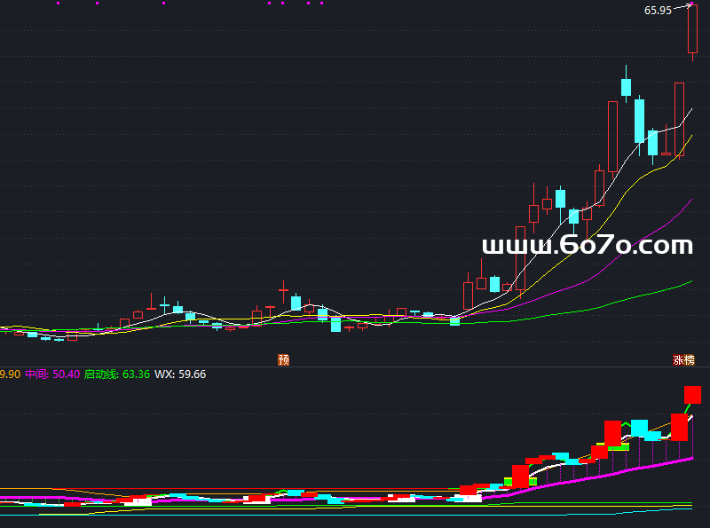 代码里的 STICKLINE 画出的那些红红绿绿的柱子,就是在告诉你:现在水温多少度了。特别是当白色线(WX)上穿紫色中轴线,并且出现红色柱状体时,往往意味着"水开了",主力不再掩饰意图,准备拉升。