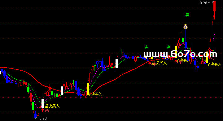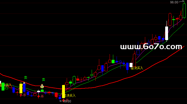当ZAI这个信号被FILTER函数确认(过滤掉瞬间的、2日内反复出现的无效信号)后,指标就会在主图相应的K线位置,标注出 "坚决买入" 的黄色文字。