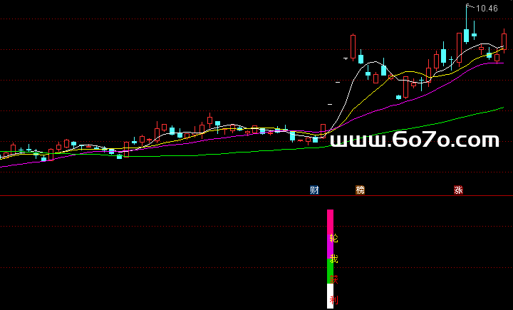 当条件满足时,指标会在副图位置画出多层彩色柱状线,从深色到浅色,从蓝色到绿色再到白色,颜色层层递进。