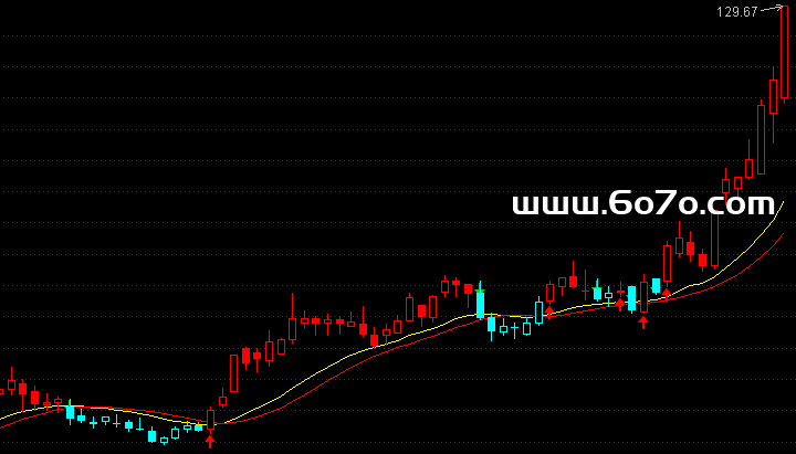 再看它主图上的K线染色逻辑 🎨 DIF>=DEA时,不管是阳线还是阴线,全部染成红色(代表多方阶段)🔴 反之,则染成青色(空方阶段)🔵 这个金叉信号(上箭头),正是在空方的青色区域消失,红色力量阶段开启的那个 "起点" 时刻给出的 ⬆️