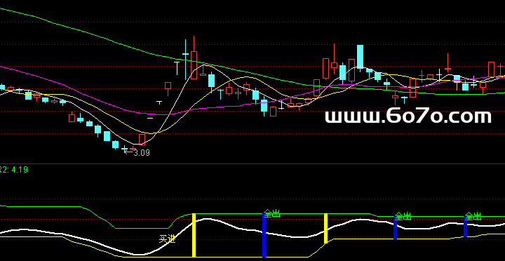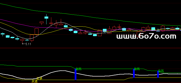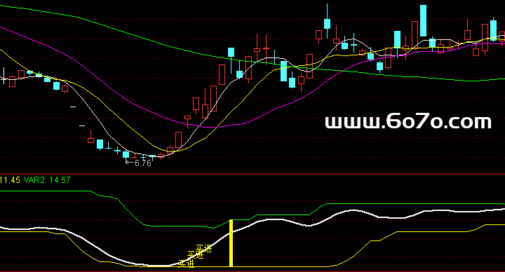 当满足条件上线上穿下线时,在VAR1和VAR2位置之间画柱状线,宽度为1,0不为0则画空心柱.,画黄色