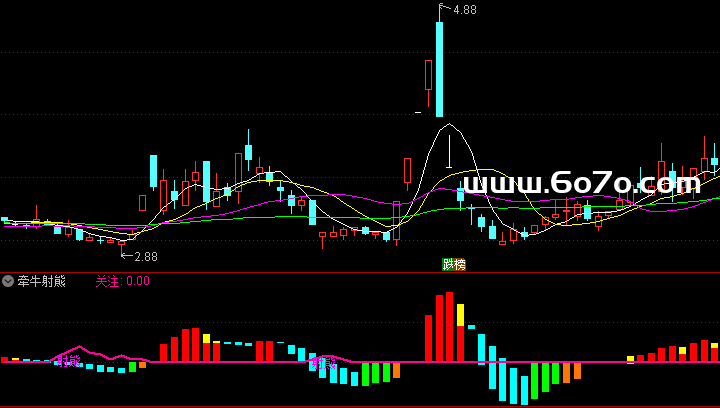 当满足条件关注上穿1.2时,在关注*0.5-6位置书写文字,COLORFF00FF
