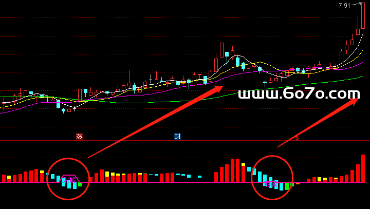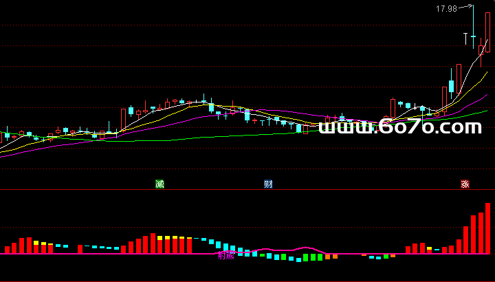 输出转强: 当满足条件VAR8>1日前的VAR8ANDVAR6<0ANDVAR6>VAR8时,在VAR8和0位置之间画柱状线,宽度为2,0不为0则画空心柱.,COLOR0077FF