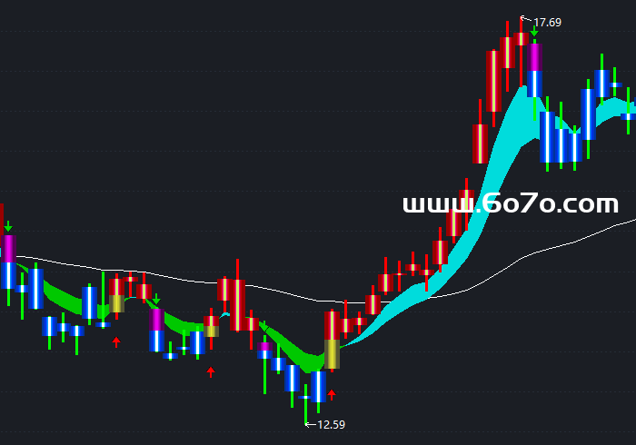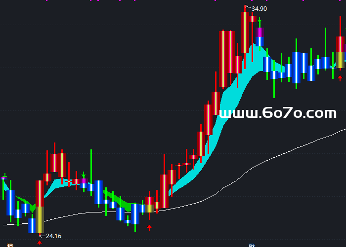 K线颜色的变化(红色/绿色)也是这套逻辑的视觉呈现——AA条件(MM在涨)对应红色,BB条件(MM在跌)对应绿色,让你一眼就能看出当前处于哪个阶段。