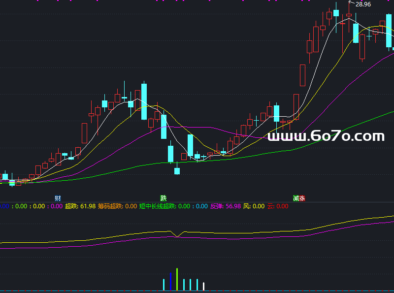云:IF(超跌=反弹 AND CYS13<=-16 AND 筹码超跌=30 AND 短中长线超跌=40,-20,0),COLORRED,STICK,LINETHICK3;