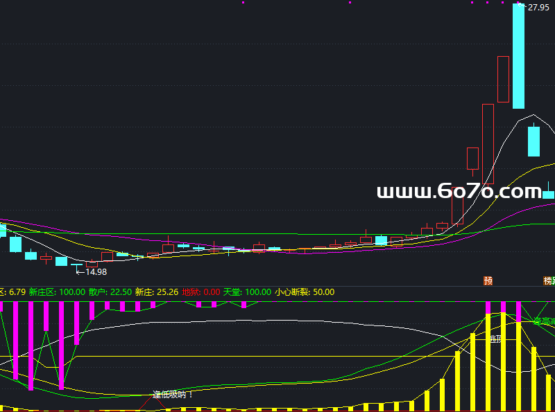 关键逻辑:当绿线突然向上穿黄线("地狱"信号),说明主力开始扫货,此时股价往往在低位;反过来绿线向下穿黄线("天堂"信号),就是主力高位抛货的预警!