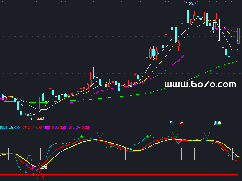 神偷出现:IF((COUNT((股神>REF(股神,1)),1)=1) AND (REF(股神,1)<REF(REF(股神,1),1)) AND (股神<跟踪),50,0),COLORF00FF0;