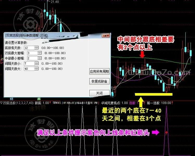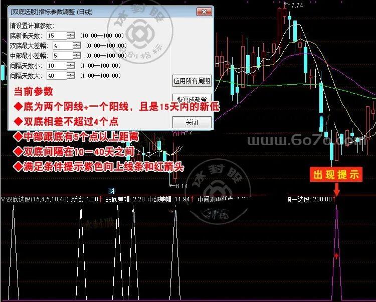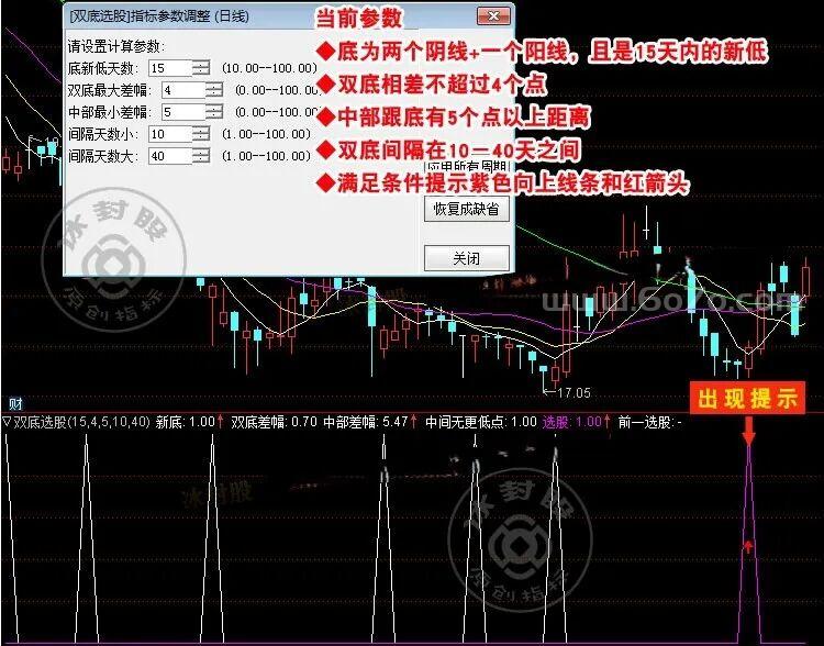 第一,两个底的间距要合适。 太近了不算双底,太远了市场结构可能已经变了。指标用「间隔天数小」和「间隔天数大」两个参数来控制这个范围。
