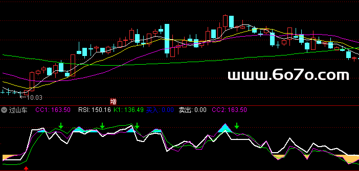 "过山车"这个指标的思路很直接:不听一家之言。它同时运行CCI、RSI和KDJ三套独立的计算体系,只有当三者全部跌到极端区域,并且RSI的动量开始拐头时,才给出买入信号。