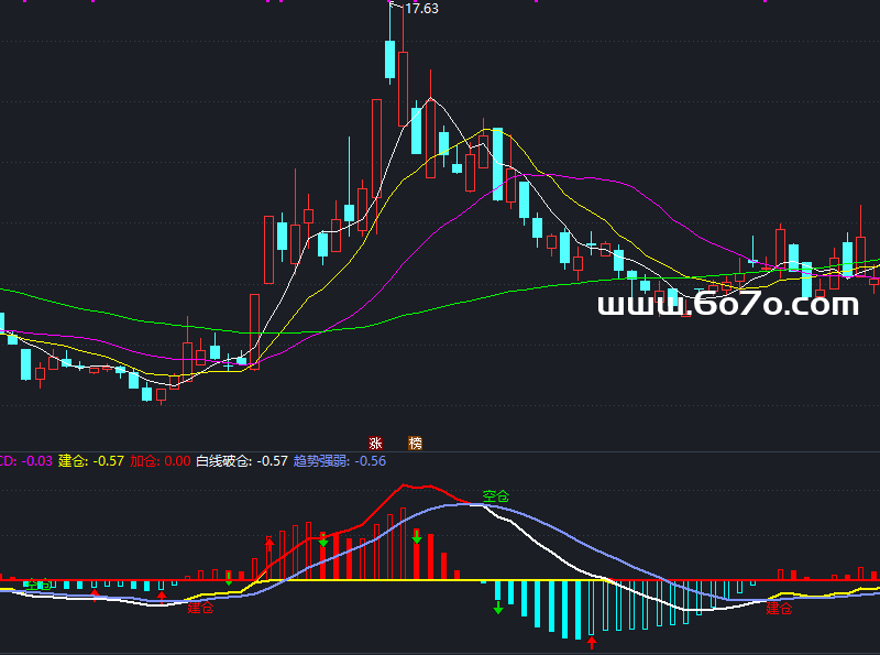 最直观的就是图上直接写的"建仓""空仓"四个字。它不只是看DIF和DEA的交叉,还结合了MACD柱(MACD2)的正负和变化节奏。比如: